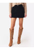 - Fit: High rise sitting right at natural waist, mini length, slight A-line shape. Model is size 25 and wearing a size 25.