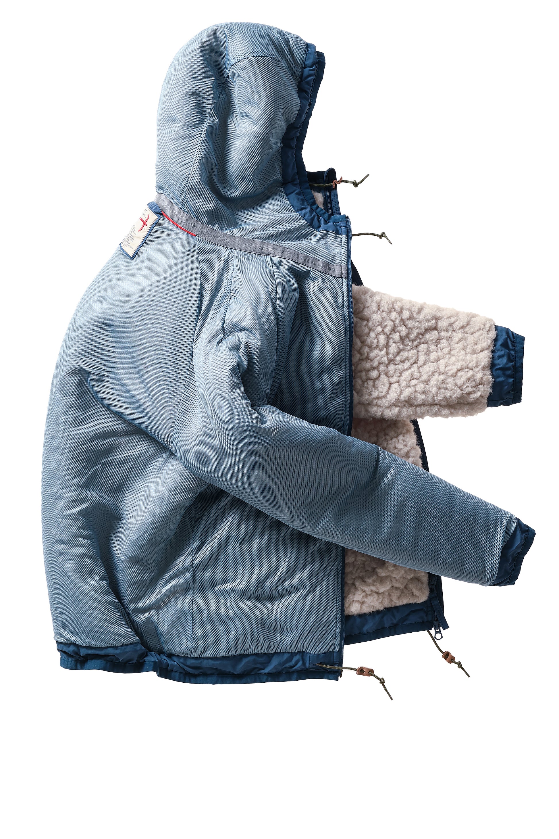 - 2-way center front, + 3 concealed cargo pockets • leather drawcord washers and pignose stoppers for drawcord positions at hood + hem