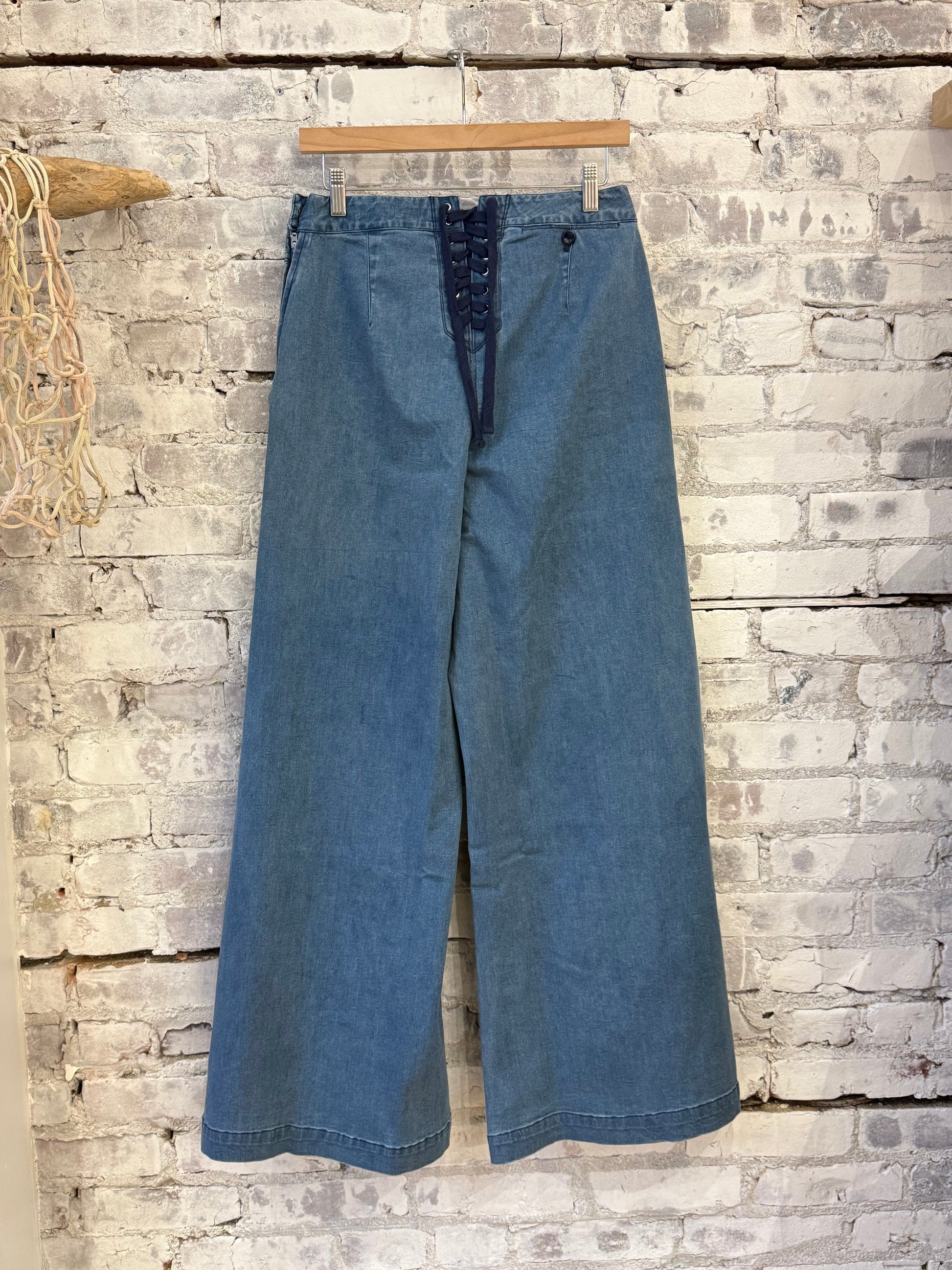 - Detail: Wide legged sailor pants in Organic Cotton Denim has authentic button and flap detailing at front with lacing and a coin pocket in back. A side zipper provides easy entry.
