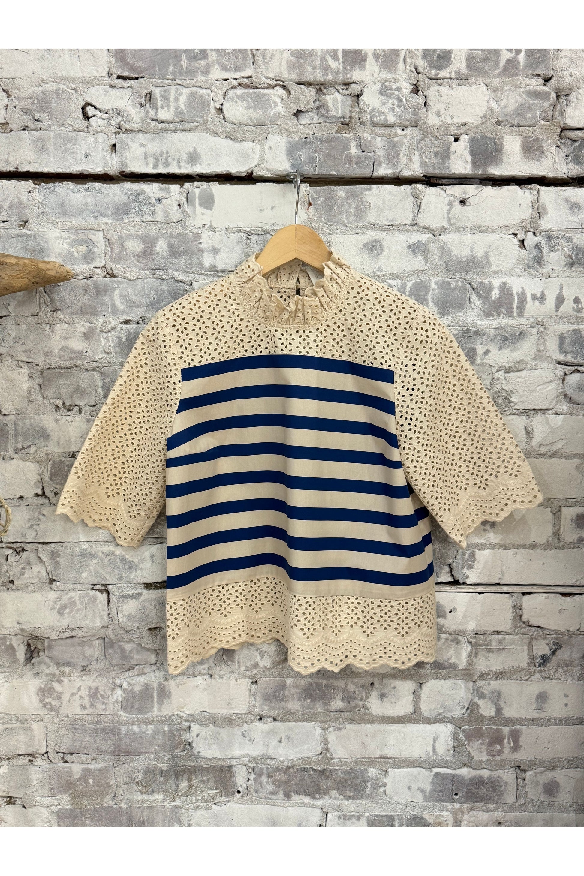 Detail: This blouse has scalloped eyelet detailing at the neckline, sleeves and hem, with the classic breton stripes printed at the bodice.