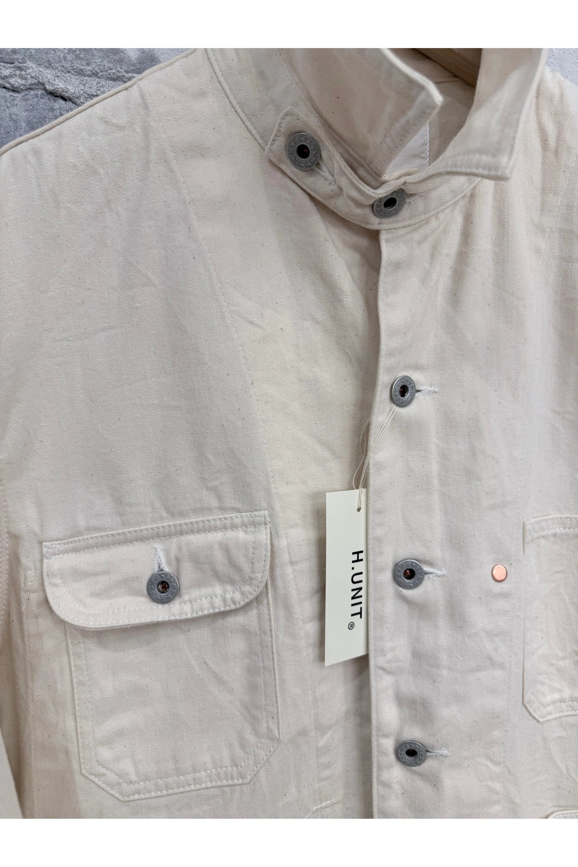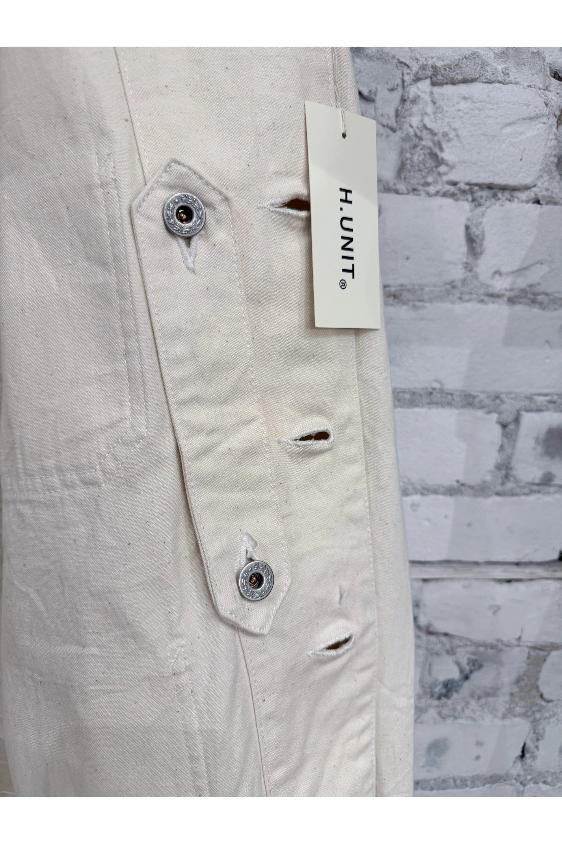 Detail: A relaxed silhouette coverall with the image of a coverall with a chin strap from the 1930s. The strap is stored on the left front back, and when you open the front and wear it, if you stop the strap and the front button, you can wear it without the front opening.