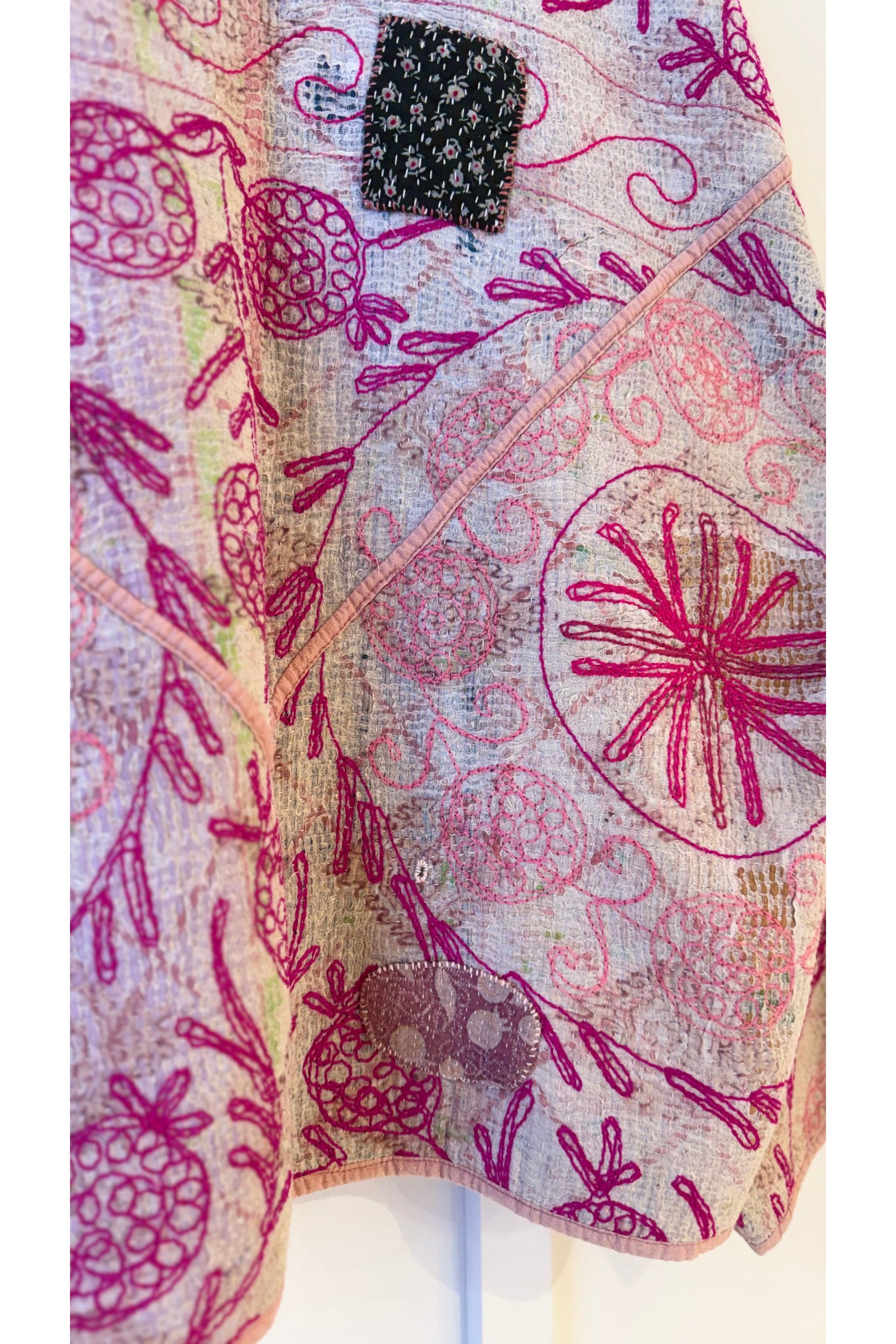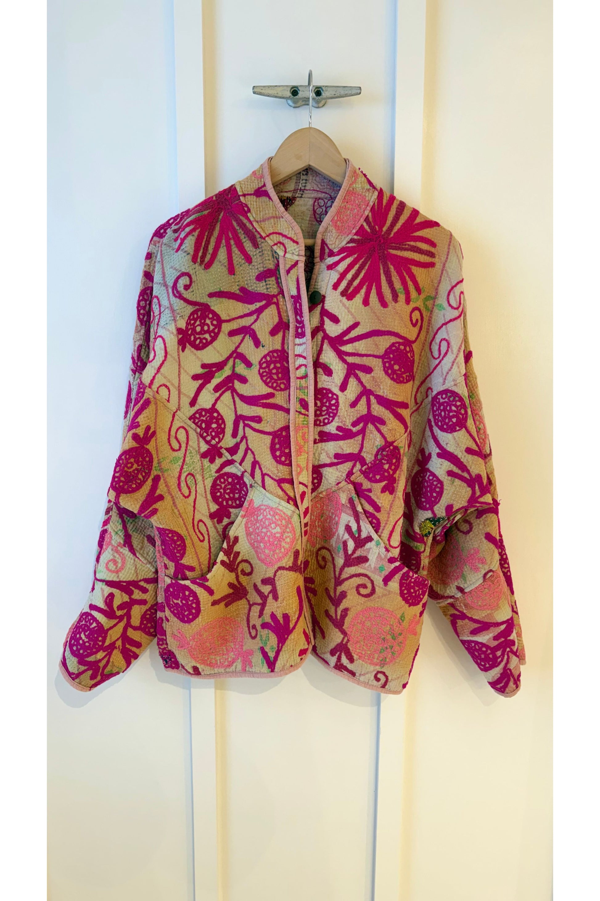 - The Suzani jackets are made from a repurposed Suzani Kantha quilt—vintage cotton stitched with colorful wool embroidery in a flowing chain-stitch style.