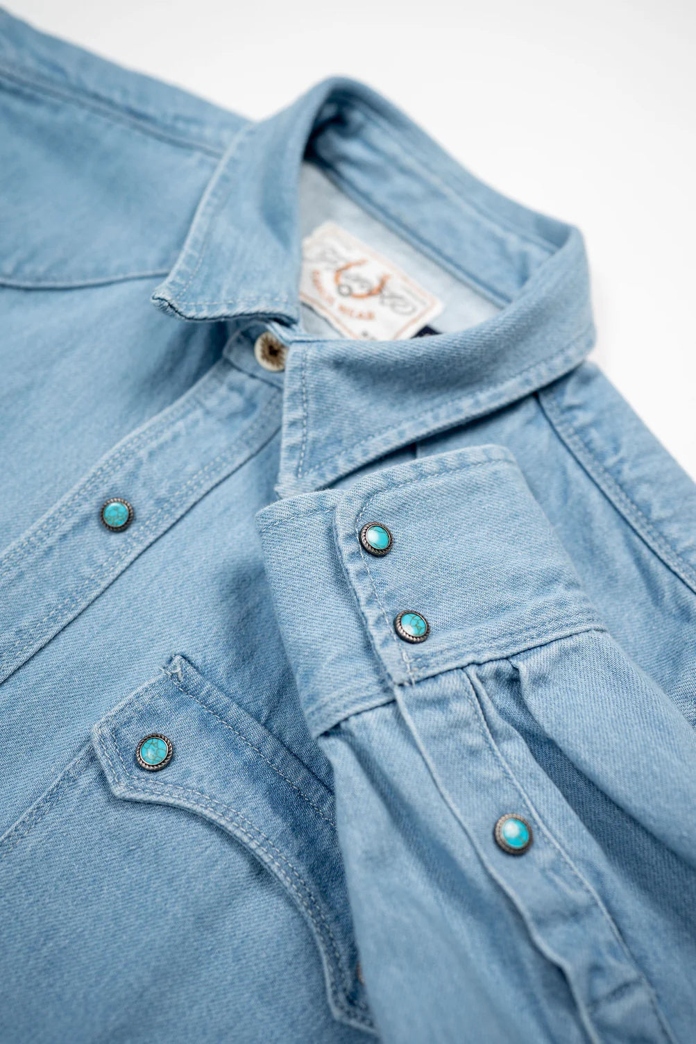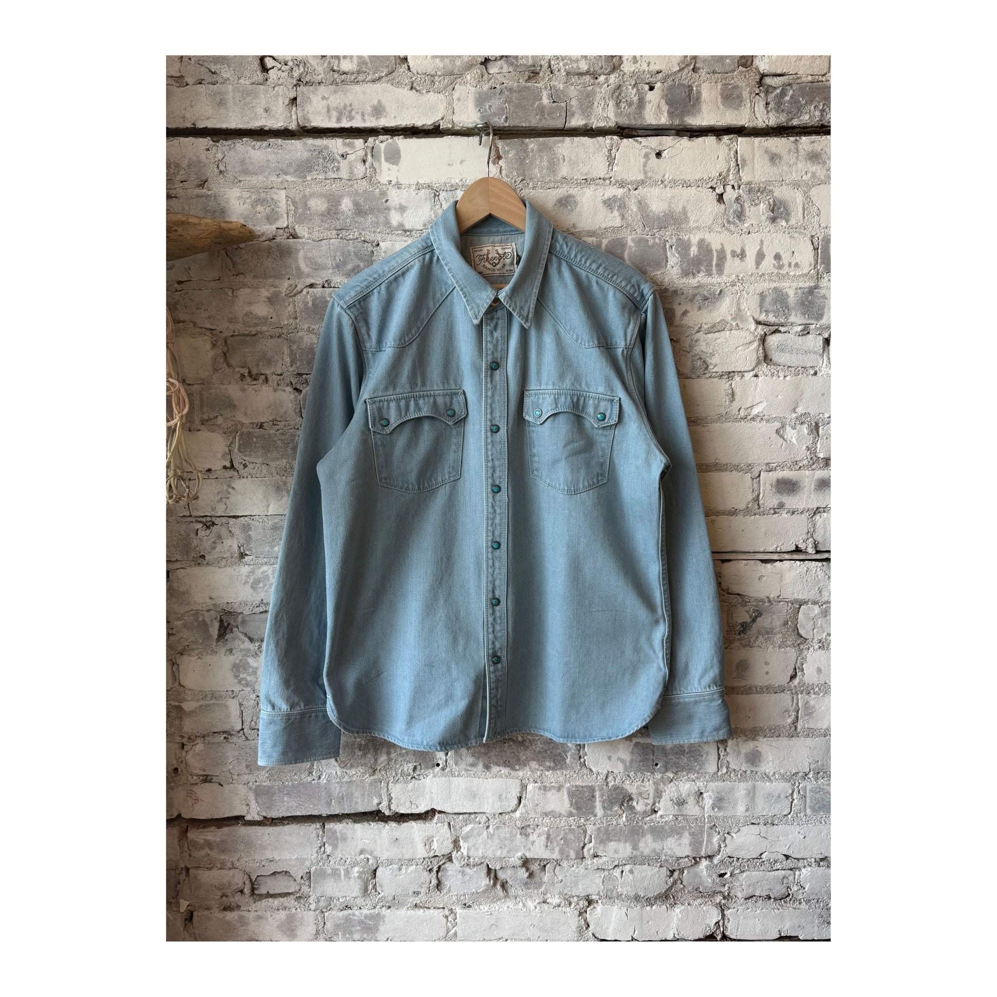Detail: The 11oz Freenote Modern Western is a special edition of their Modern Western shirt, that's been bleached out and adorned custom Italian turquoise buttons. The fabric is their 11oz Japanese selvedge denim from Yoshiwa Mills that's been given a bleached washed for a softer, more laid back vibe. They've added a lil' flare by adding turquoise buttons, that stand out without standing out.