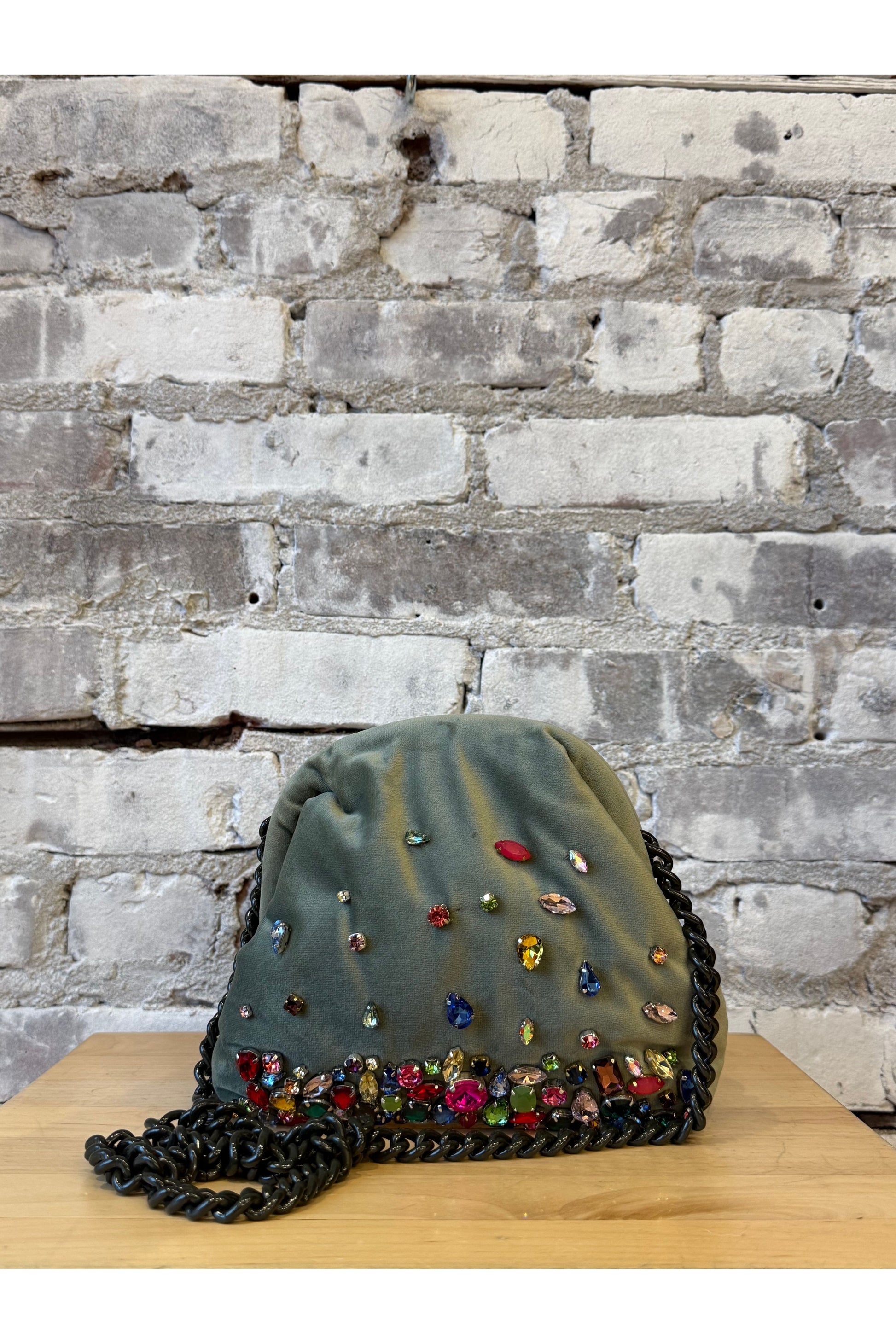 - Detail: Small clutch in soft velvet combines refinement and craftsmanship. It is a small masterpiece of elegance. The hand-embroidered stones embellish the surface, creating a play of light and texture that captures the eye. Compact and sophisticated, it is the ideal accessory for evening events or occasion looks. Each piece is unique, the result of craftsmanship with attention to the smallest details.