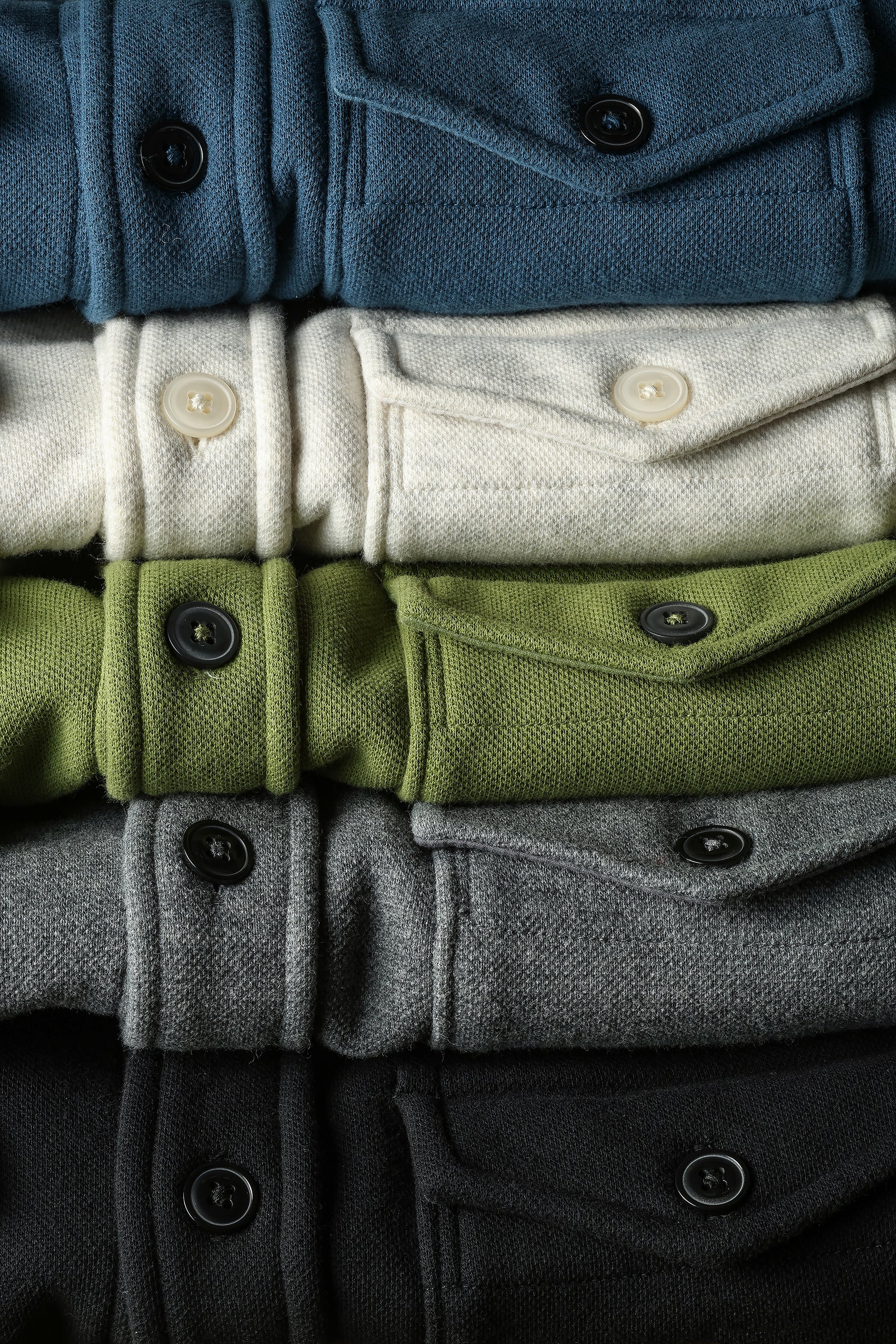 - Woven cotton sheeting facings at collarband, top collar, center placket, sleeve binding, cuffs, and flap chest pockets for reduced thickness and holding shape