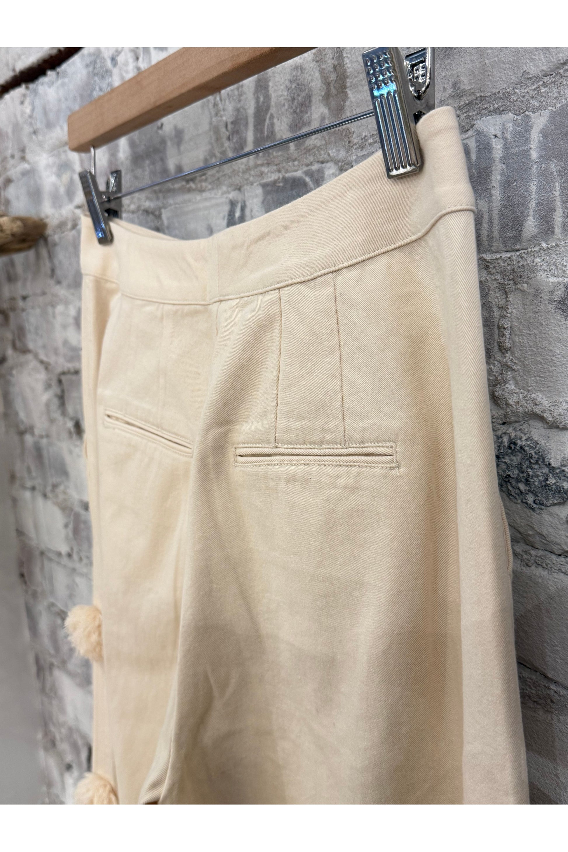 - Detail: Relaxed fit pants are decorated with cotton thread pom pom details at sides. Off-seam pockets at front. Fully lined with organic cotton lawn.